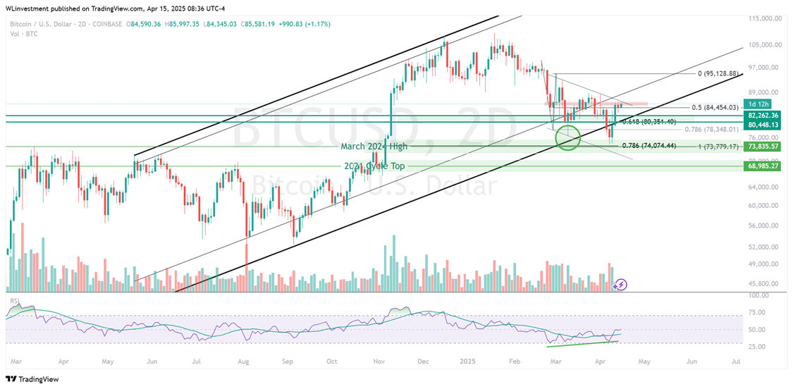 We hit it perfectly and got an $11,000 bounce out of the zone, and then printed a marginally lower low, testing the March 2024 high. This put in a very nice divergent bottom and I believe that was “it” for BTC, failing some kind of catastrophic China/US spat like a regional war. Shorter term, we are at resistance so I would look to buy dips in the 80-82k range on BTC and hold for potentially new all time highs.